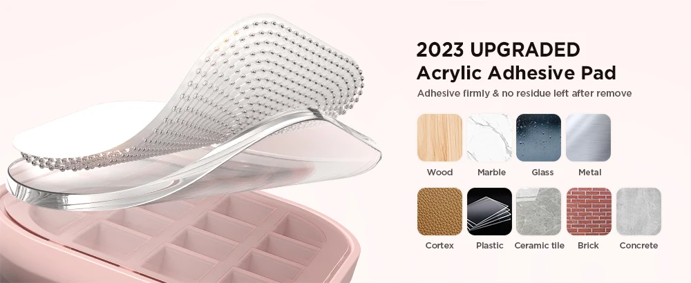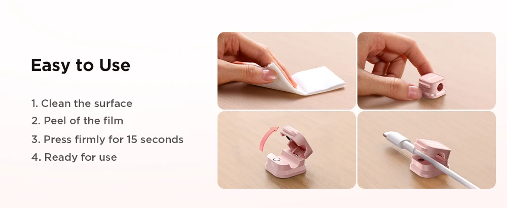 – *Adesivo Acrílico Aprimorado Sem Resíduo*: O adesivo acrílico atualizado permite que o organizador de cabos adira firmemente a quase qualquer superfície plana e limpa, como mesas de madeira, vidro e azulejos cerâmicos, sem deixar resíduos ao ser removido. Inclui uma almofada adesiva de substituição para reutilização do suporte de cabo.